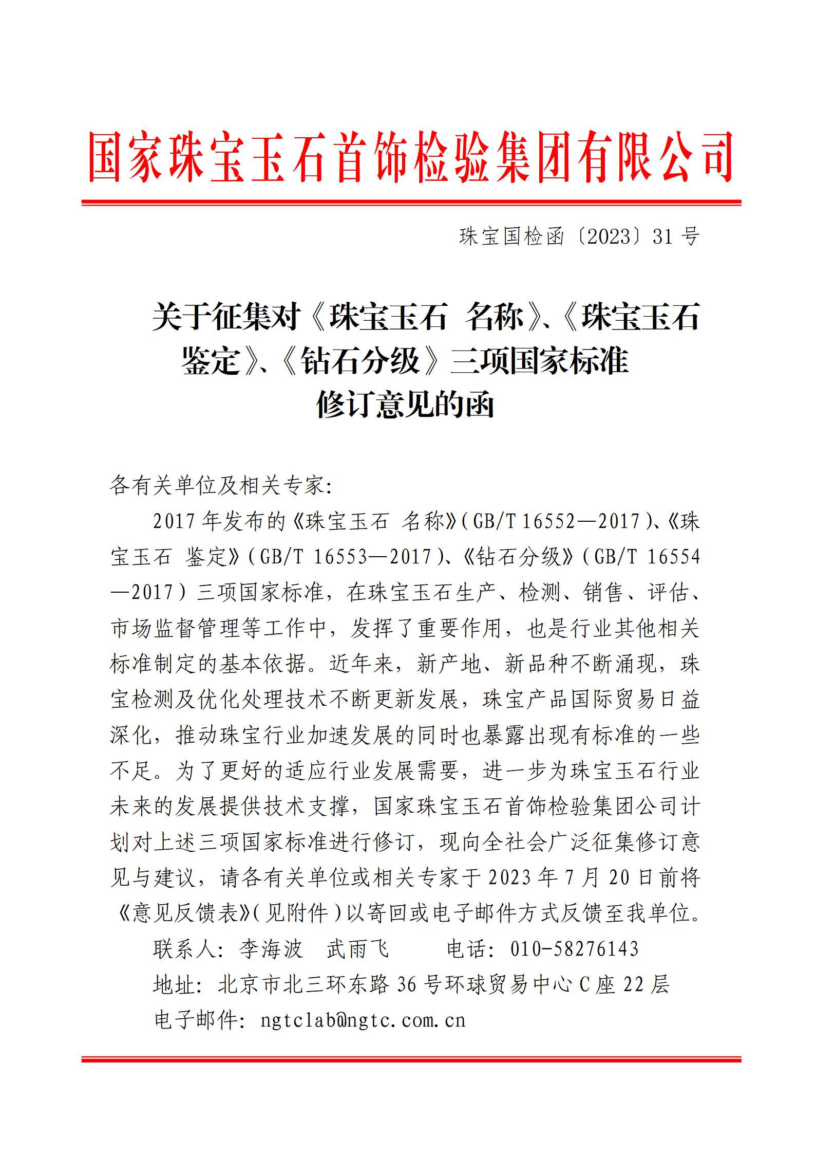 关于征集对《珠宝玉石 名称》、《珠宝玉石 鉴定》、《钻石分级》三项国家标准修订意见的函