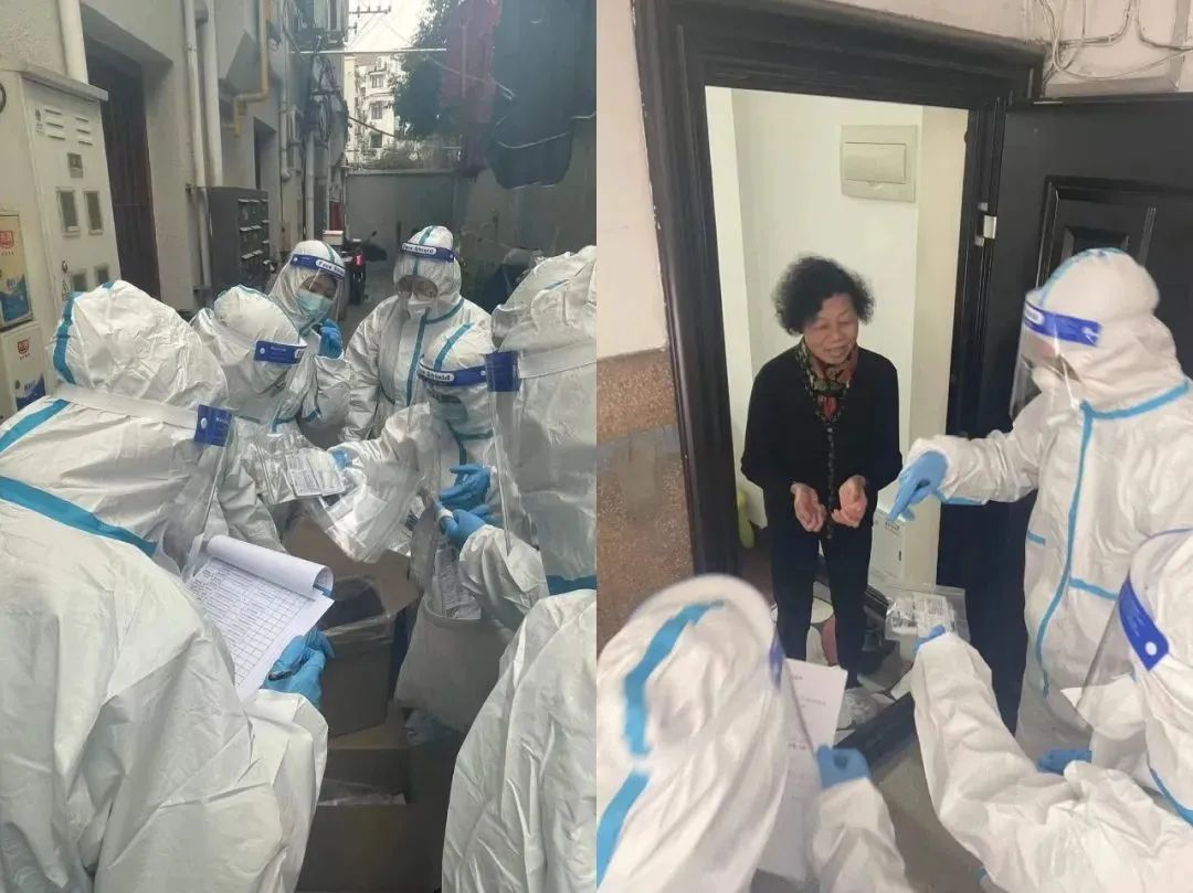 居民区里既有老式里弄、也有30年代法商建造的多层公寓大楼,志愿者身穿“大白”防护服,头戴防护面罩,跟着包块社工穿梭在狭窄的楼道,没一会就满头大汗,身上散发的热气在面罩上形成了一层水雾,但是大家毫无怨言,仍旧有条不紊地为居民做好检测工作,居民们也被志愿者们的辛勤付出所感动,主动配合接过抗原试剂,及时开展自测工作。经过近4个小时的努力,大家圆满地完成了此次支援任务。