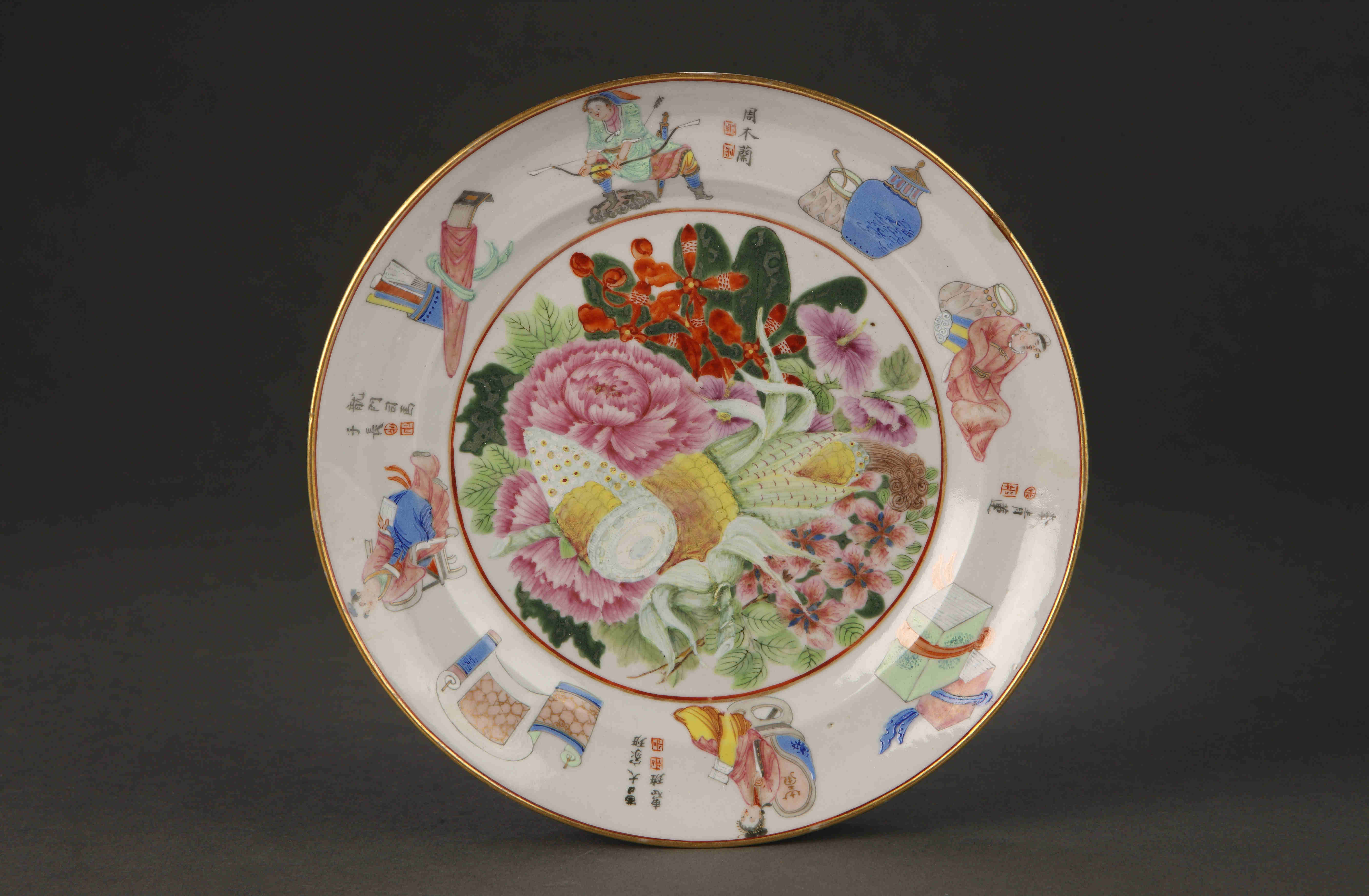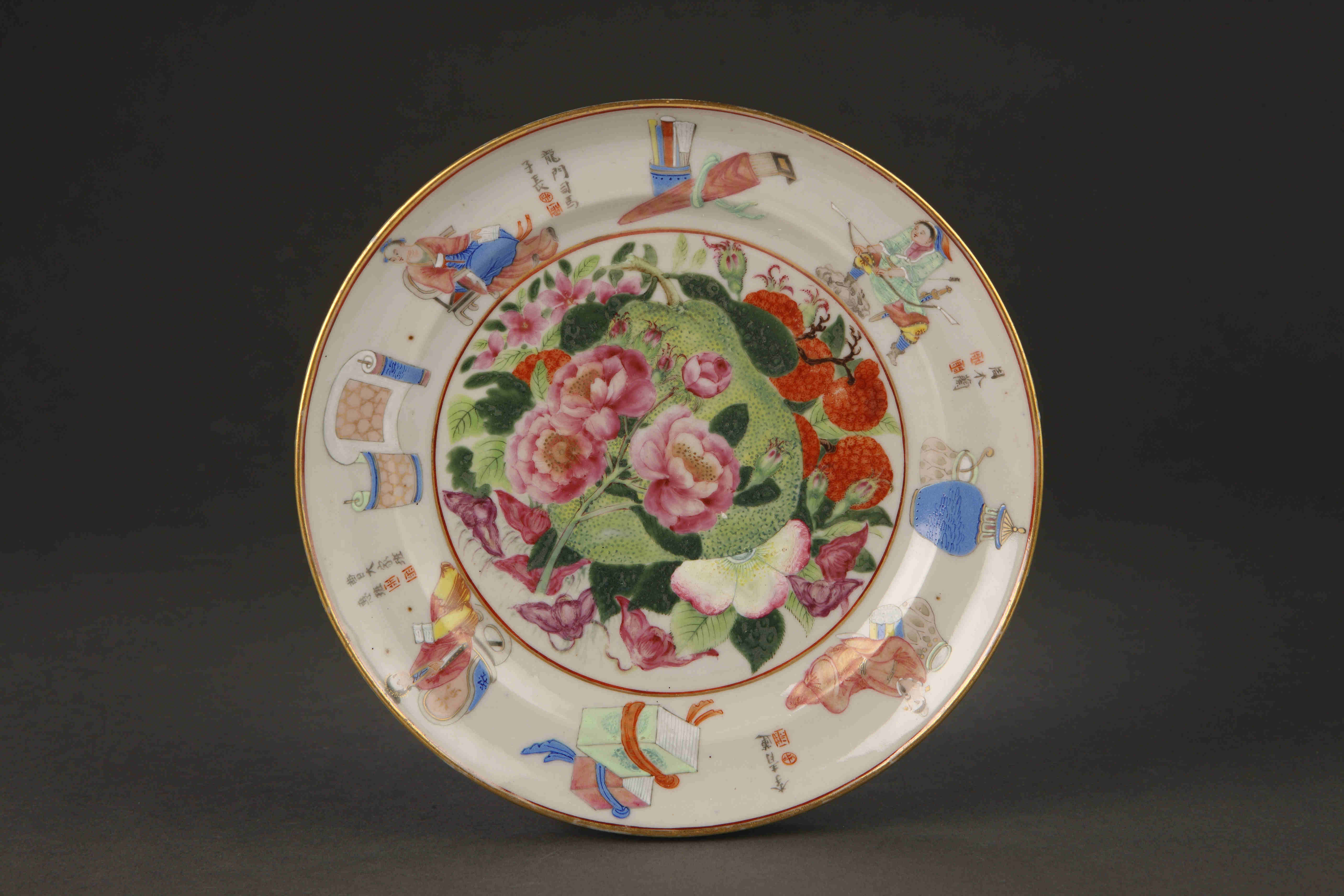 “外销瓷”是指我国生产的,专门销往国外的瓷器,清代“一口通商”时期,中国瓷器远销欧美,对欧美人民生活影响深远。这一时期输出的瓷器种类众多,有粉彩、广彩、青花、五彩等,器物造型及纹饰图案既保留了中国制瓷艺术的传统特征,又汲取了欧美的艺术精华,从而烧制出了大量精美的瓷器。图为清道光广彩描金《无双谱》花果纹碟