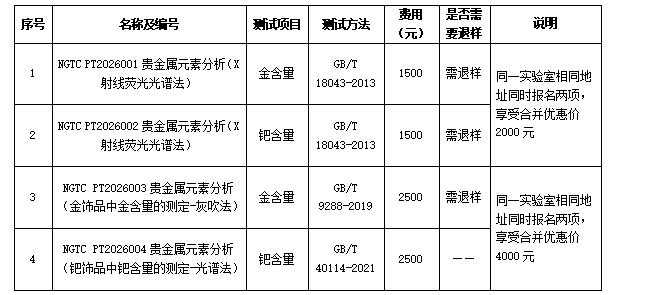 NGTC PT2026001“贵金属元素分析(X射线荧光光谱法)”能力验证计划的检测项目为“金含量”,采用的检测方法为GB/T 18043-2013《首饰 贵金属含量的测定 X射线荧光光谱法》。